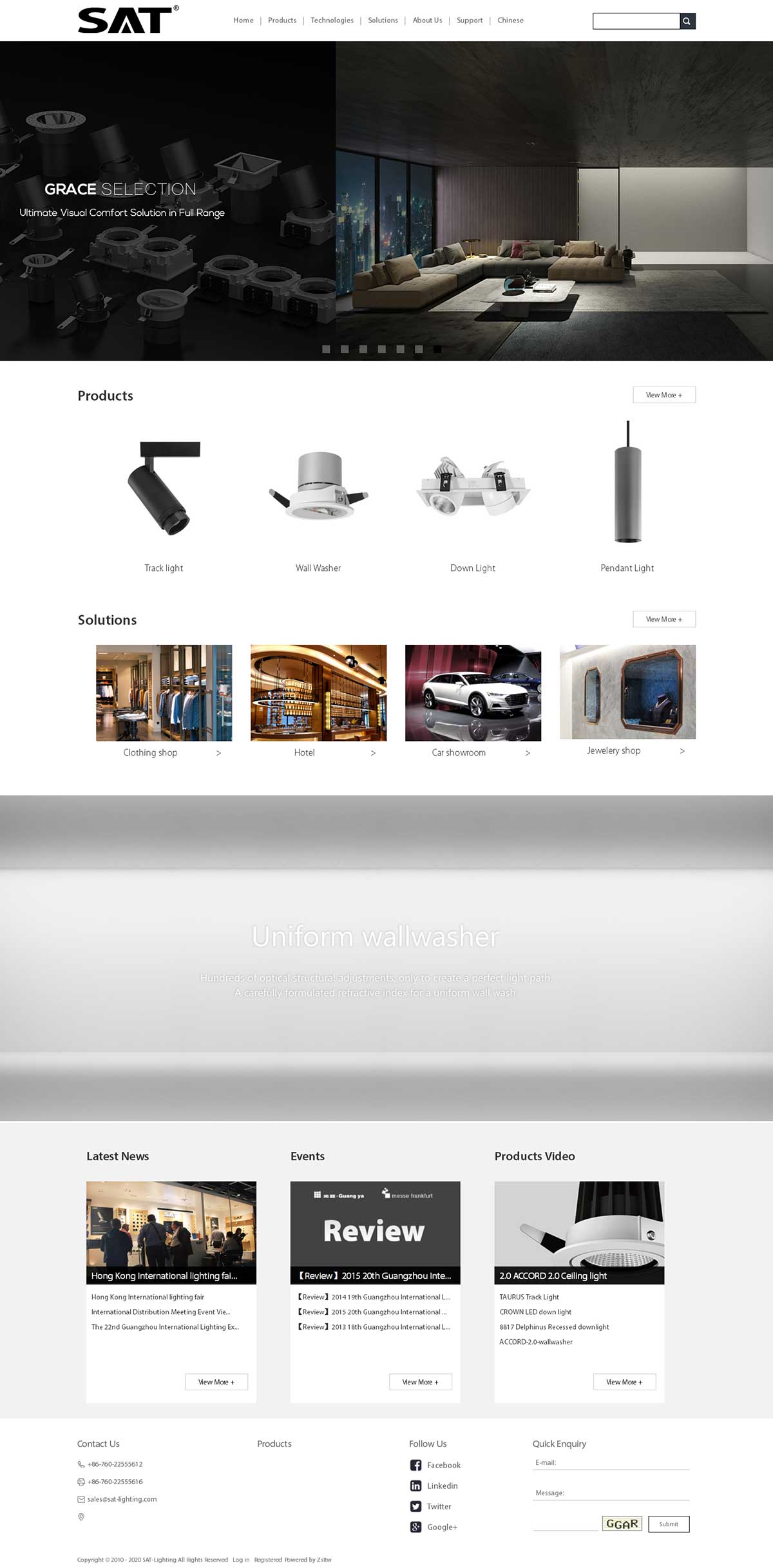 广东思雅特科技有限公司,英文名称 “SAT INT`L ILLUMINATION CO.,LTD”, 简称 “SAT照明”。SAT照明是一家以科技、节能的理念,致力于照明技术的发展,专注LED新一代绿色照明产品的研发、生产、销售和服务于一体的专业照明电器有限公司。SAT照明主要提供餐饮照明、店铺照明、酒店照明、别墅照明应用解决方案,同时涵盖办公、商场等多个商照领域,产品包括天花射灯、洗墙灯、筒灯、导轨灯、多功能嵌入式灯具等多个大类,1千多个产品。定位在精品用光的SAT照明,围绕顾客、市场需求,开创照明产品+,以独创的DASS大师照明定制系统给客户提供高品质的照明产品以及专业的照明设计服务,为顾客提供精品的用光体验,最终奠定了SAT照明在商业照明领域中专业的品牌地位。SAT照明实现全球品牌战略,公司产品通过3C、欧盟CE认证,多项产品达到70多个国家标准,并获多项国家专利。