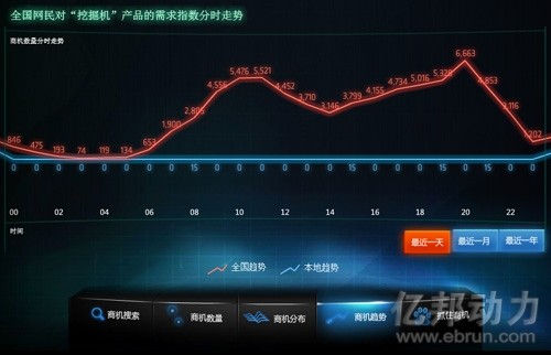 亿邦动力网尝试在“百度商情”中搜索“挖掘机”显示:网民在百度中共搜索了72939次“挖掘机”相关产品及服务,其中29079次搜索有明确的需求意向。需求意向还被具体分解为行业热门需求、行业突增需求和行业相关需求。