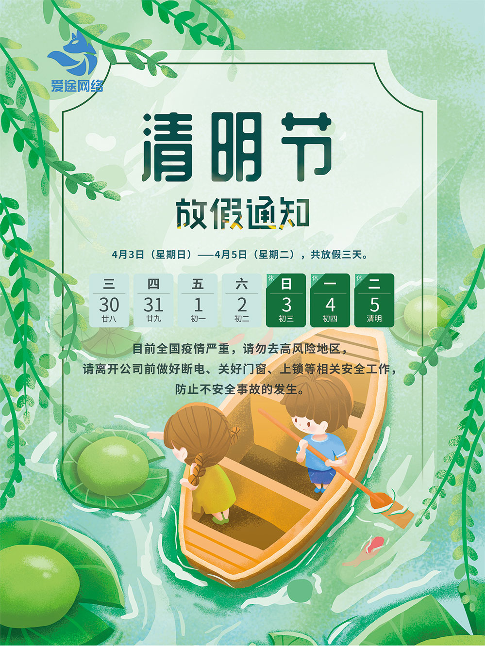 尊敬的客户朋友: 根据国家有关清明节放假的规定,结合公司实际情况,决定对清明节期间的放假时间安排如下: 放假时间:2022年4月3号---2022年4月5号。