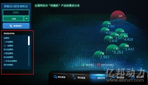 亿邦动力网尝试在“百度商情”中搜索“挖掘机”显示:网民在百度中共搜索了72939次“挖掘机”相关产品及服务,其中29079次搜索有明确的需求意向。需求意向还被具体分解为行业热门需求、行业突增需求和行业相关需求。